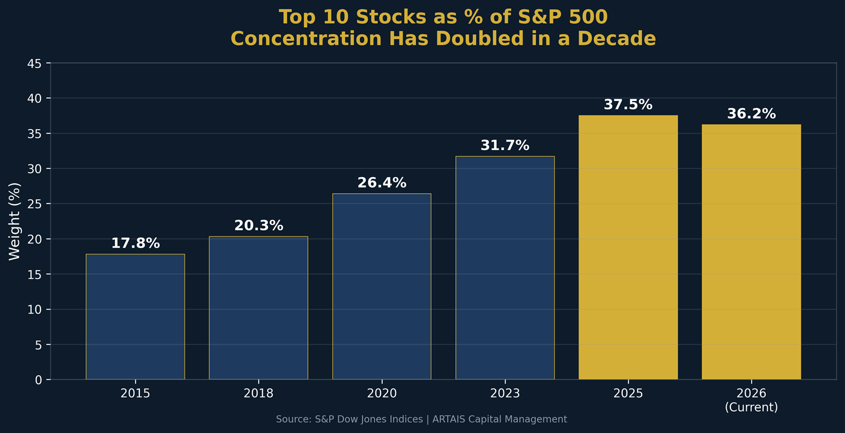 As of April 2026, the top 10 stocks in the S&P 500 account for approximately 35.6% of the entire index, according to S&P Dow Jones Indices. That figure sat around 18% just a decade ago.